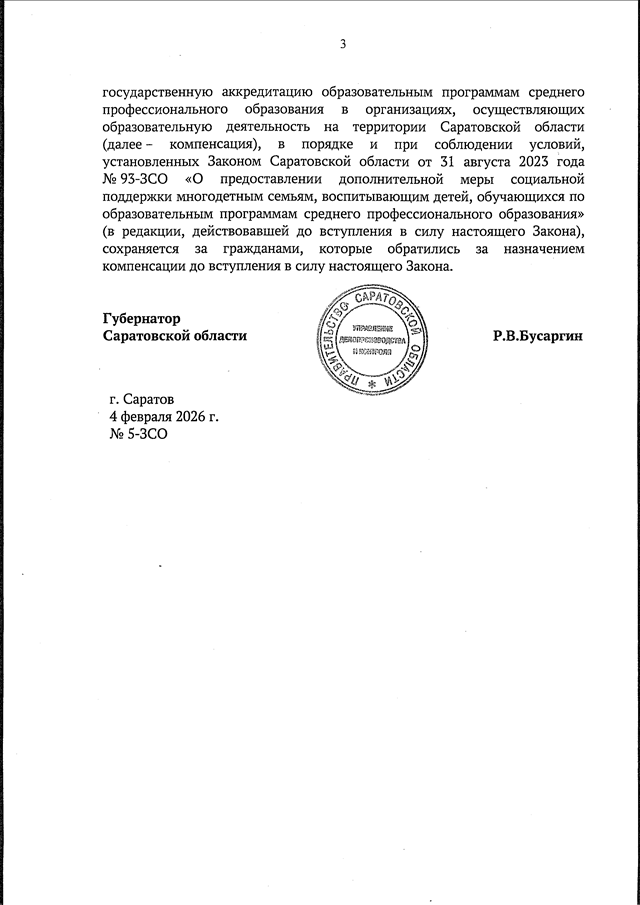 Закон Саратовской области от 04.02.2026 N 5-ЗСО "О внесении изменений в Закон Саратовской области "О предоставлении дополнительной меры социальной поддержки многодетным семьям, воспитывающим детей, обучающихся по образовательным программам среднего профессионального образования" (принят Саратовской областной Думой 28.01.2026)