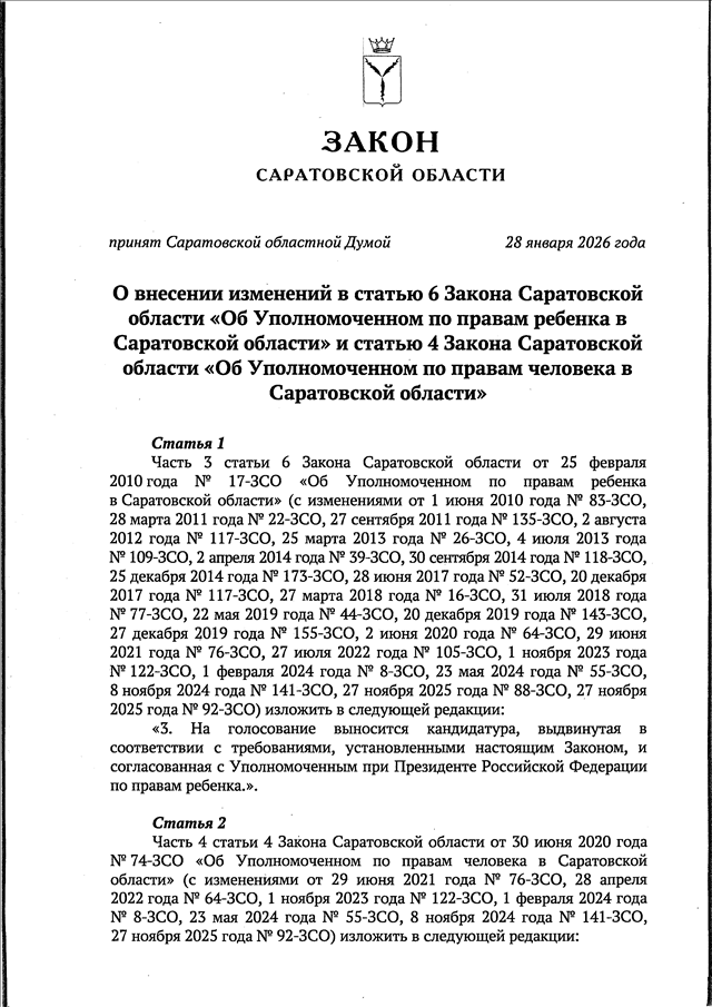 Закон Саратовской области от 04.02.2026 N 8-ЗСО "О внесении изменений в статью 6 Закона Саратовской области "Об Уполномоченном по правам ребенка в Саратовской области" и статью 4 Закона Саратовской области "Об Уполномоченном по правам человека в Саратовской области" (принят Саратовской областной Думой 28.01.2026)