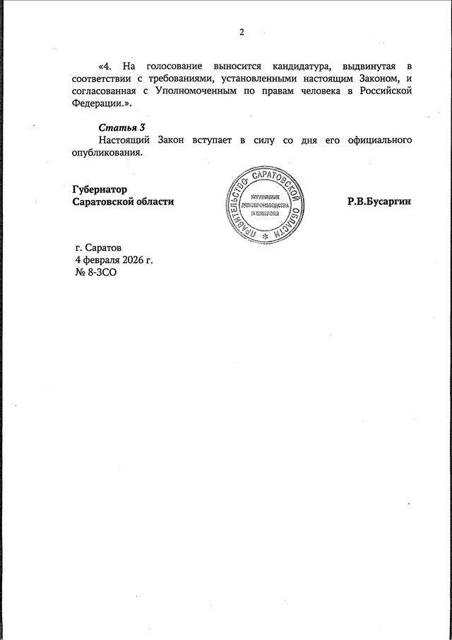 Закон Саратовской области от 04.02.2026 N 8-ЗСО "О внесении изменений в статью 6 Закона Саратовской области "Об Уполномоченном по правам ребенка в Саратовской области" и статью 4 Закона Саратовской области "Об Уполномоченном по правам человека в Саратовской области" (принят Саратовской областной Думой 28.01.2026)