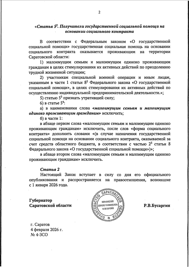 Закон Саратовской области от 04.02.2026 N 4-ЗСО "О внесении изменений в Закон Саратовской области "О государственной социальной помощи в Саратовской области" (принят Саратовской областной Думой 28.01.2026)
