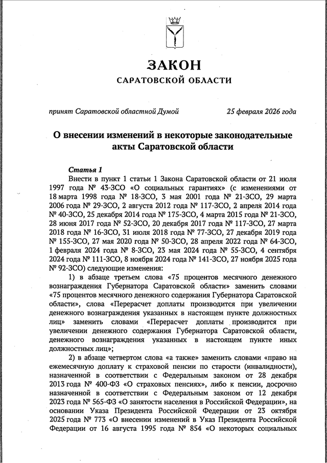 Закон Саратовской области от 26.02.2026 N 11-ЗСО "О внесении изменений в некоторые законодательные акты Саратовской области" (принят Саратовской областной Думой 25.02.2026)