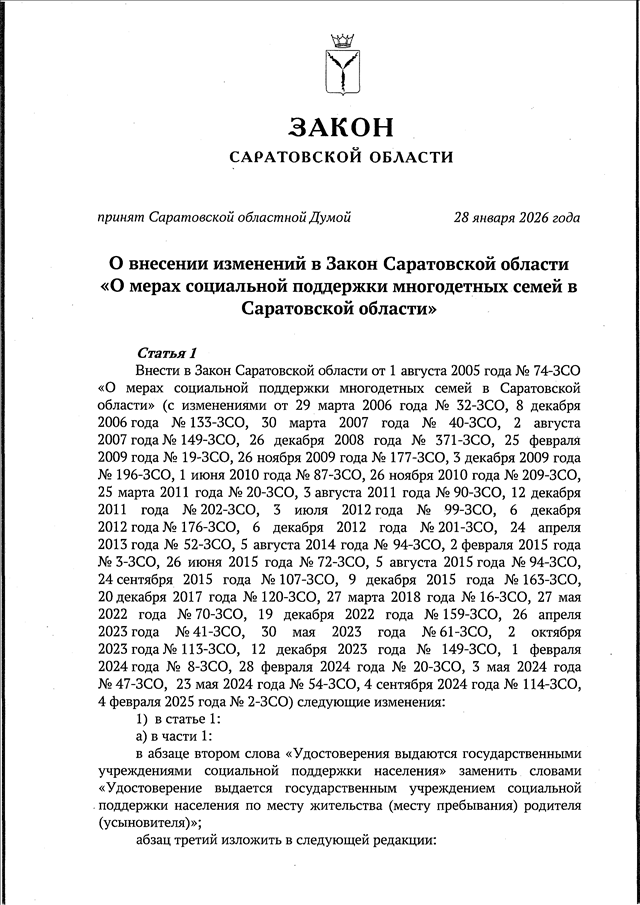 Закон Саратовской области от 04.02.2026 N 2-ЗСО "О внесении изменений в Закон Саратовской области "О мерах социальной поддержки многодетных семей в Саратовской области" (принят Саратовской областной Думой 28.01.2026)