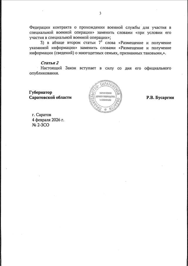 Закон Саратовской области от 04.02.2026 N 2-ЗСО "О внесении изменений в Закон Саратовской области "О мерах социальной поддержки многодетных семей в Саратовской области" (принят Саратовской областной Думой 28.01.2026)