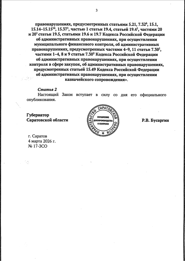 Закон Саратовской области от 04.03.2026 N 17-ЗСО "О внесении изменений в Закон Саратовской области "Об административных правонарушениях на территории Саратовской области" (принят Саратовской областной Думой 25.02.2026)