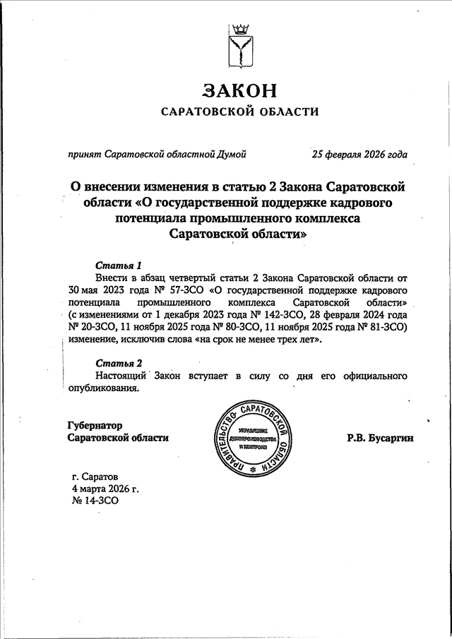 Закон Саратовской области от 04.03.2026 N 14-ЗСО "О внесении изменения в статью 2 Закона Саратовской области "О государственной поддержке кадрового потенциала промышленного комплекса Саратовской области" (принят Саратовской областной Думой 25.02.2026)