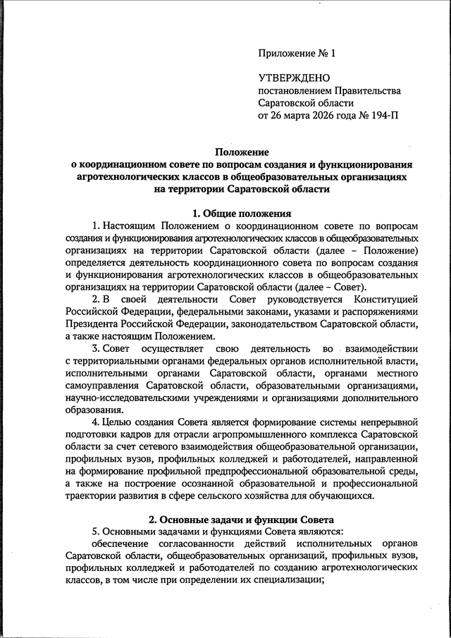 Постановление Правительства Саратовской области от 26.03.2026 N 194-П "О создании координационного совета по вопросам создания и функционирования агротехнологических классов в общеобразовательных организациях на территории Саратовской области" (вместе с "Положением о координационном совете по вопросам создания и функционирования агротехнологических классов в общеобразовательных организациях на территории Саратовской области")