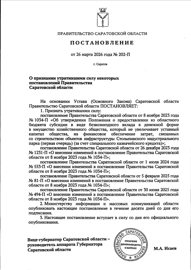 Постановление Правительства Саратовской области от 26.03.2026 N 202-П "О признании утратившими силу некоторых постановлений Правительства Саратовской области"