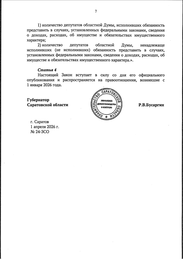 Закон Саратовской области от 01.04.2026 N 24-ЗСО "О внесении изменений в некоторые законодательные акты Саратовской области" (принят Саратовской областной Думой 25.03.2026)