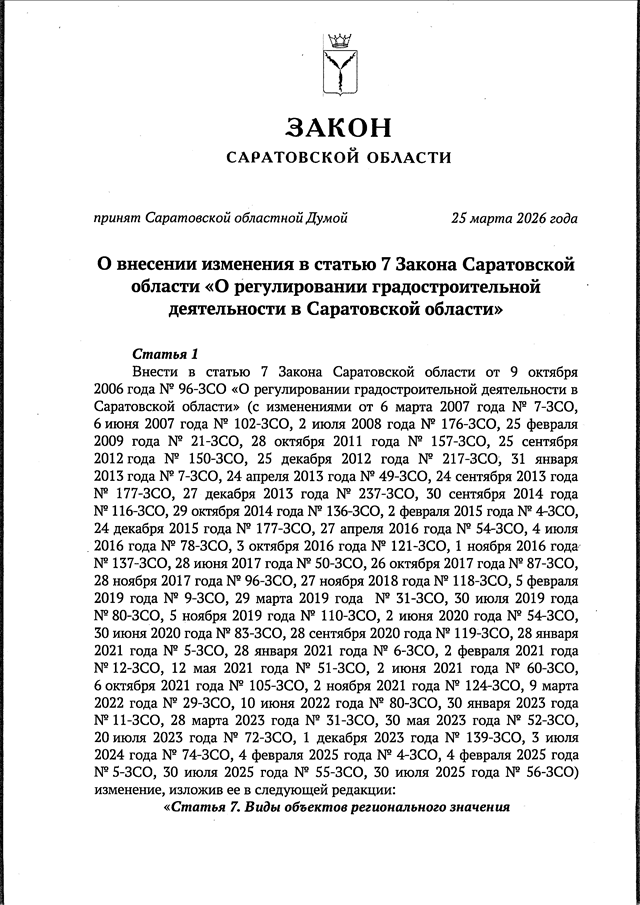 Закон Саратовской области от 01.04.2026 N 22-ЗСО "О внесении изменения в статью 7 Закона Саратовской области "О регулировании градостроительной деятельности в Саратовской области" (принят Саратовской областной Думой 25.03.2026)